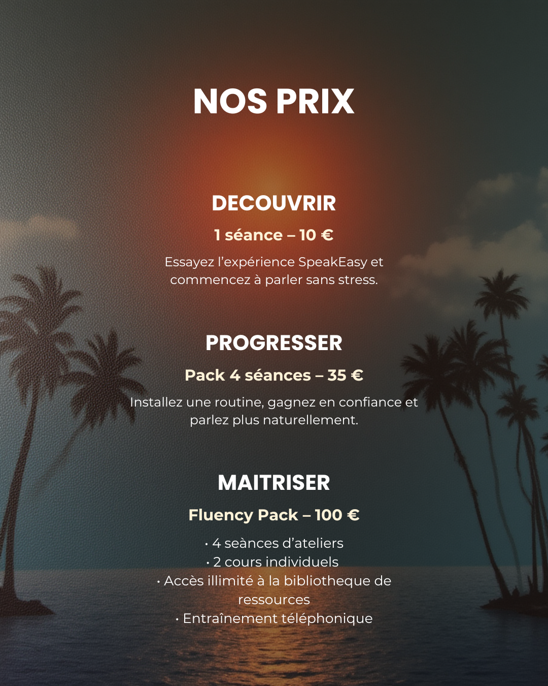 Chez SpeakEasy English, profitez d’un moment de détente après le travail tout en pratiquant l’anglais avec un petit groupe convivial. Nos ateliers sont encadrés avec douceur par une professeure native expérimentée, qui vous guide pour parler plus naturellement et gagner en confiance. Vous pouvez essayer votre premier atelier gratuitement si vous mentionnez le code secret : Pineapple